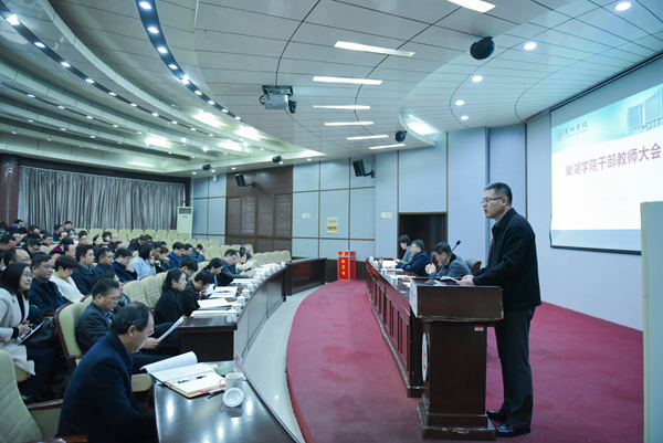 3月20日下午,学校在致知楼报告厅召开干部教师大会。省委第十一综合考核组全体成员出席会议。学校省管领导干部、机关部门领导成员、二级学院党政正职(含主持工作副职)、省级以上“两代表一委员”、民主党派市级以上主委、教代会执委、正高以上职称人员和学生代表参加会议。会议由校党委书记周峰主持。