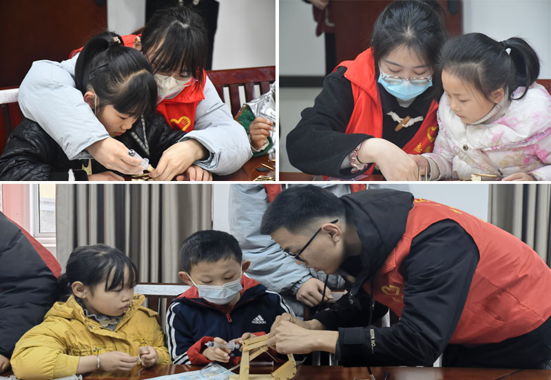 “今天我教两个小朋友合作用一份材料包完成拼搭任务,过程中提升了小朋友们的团队合作能力和动手实践能力,自己通过志愿服务也获得了成长。”党员学生孟浩然说。