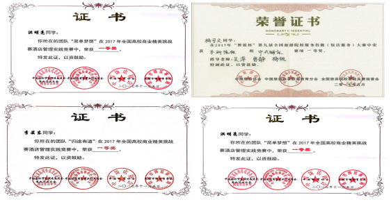 ◆近年学生获得第三届全国导游大赛铜奖和最佳人气奖;全国饭店服务技能大赛一等奖3项、二等奖1项;安徽省茶艺比赛团体二等奖2项;全国高校商业精英挑战赛一等奖5项等多项国家(省部)级学科竞赛奖项。
