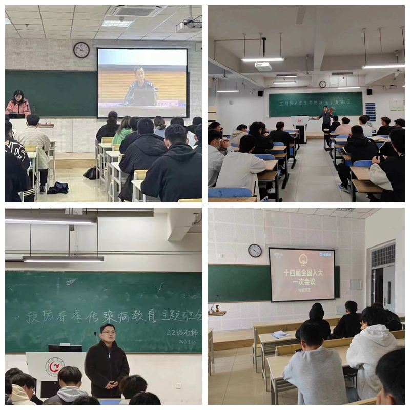 班会简介:体育学院辅导员3月份主题班会分别以“学习两会 团结奋斗”“学习雷锋精神 争当追‘锋’青年”等为主题,通过组织开展收听收看全国“两会”开幕盛况、学习习近平总书记关于弘扬雷锋精神的重要论述、学习共青团中央《关于在第24个“中国青年志愿者服务日”前后开展青年志愿者服务社区行动的工作提示》等活动,引导学生深切感受5年来在以习近平同志为核心的党中央带领下,我国社会发展取得的成就和面临的挑战,号召广大青年持续追寻雷锋的足迹,在奉献中体现作为,在实践中传播文明。各班级还就防范电信网络诈骗、预防春季传染病等工作进行了具体布置。