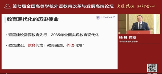 25日上午的开幕式由北外校长杨丹致辞,他以“教育强国,外语何为”为主题,分享了北京外国语大学在外语教育方面的探索经验:第一,重构外语类高校学科格局,构建“全球语言、全球文化、全球治理”的学科发展总体布局。第二,推进语言科技融合,服务科技强国建设。第三,重构全球育人体系,服务世界人才高地建设。他表示,本次高端论坛是北外与学界保持深度联系的重要实践之一,北外愿与全国外语教育同仁一道,携手推动我国外语教育实现高质量发展。