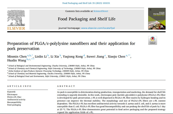 我院陈敏敏博士长期从事食品复合膜活性包装以及功能性纳米材料的研究。最近,在食品包装材料研究中取得新进展,相关成果以“Preparation of PLGA/ε-polylysinenanofibersand their application for pork preservation”为题发表在国际权威期刊《Food Packaging and Shelf Life》(中科院一区,IF:8.749)。